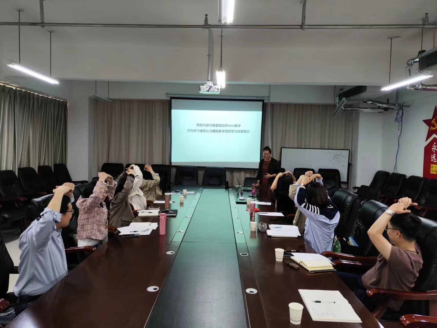 刘老师首先向教师介绍“BOPPPS教学设计”模型所包含的6个教学环节,并进行微课教学示范。接着,全体学员教师实操演练,完成各自的BOPPPS微课教学设计,并相互交流和集体讨论。最后,刘老师对现场学员提出的各种问题一一做出详细解答和针对性指导。