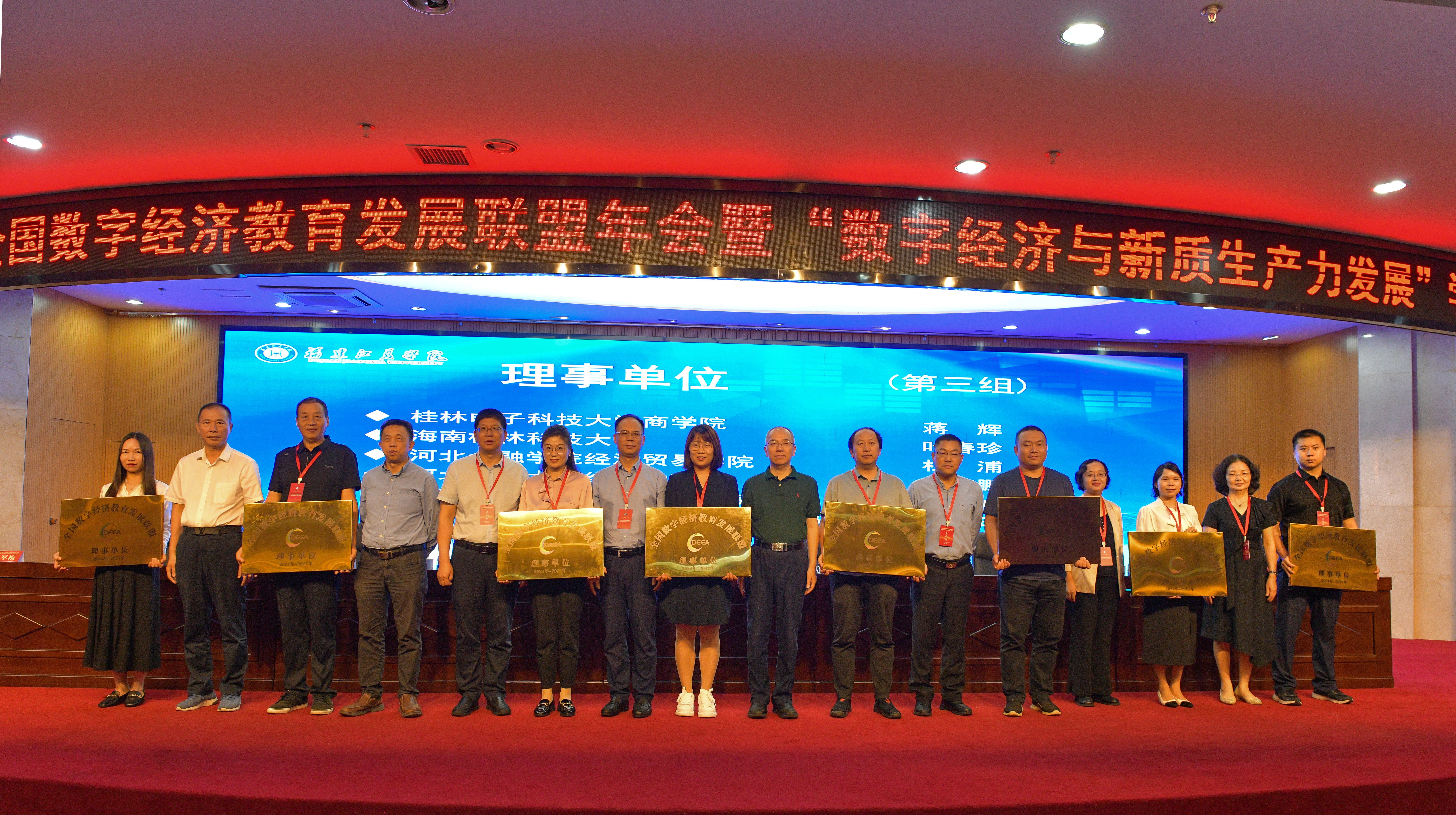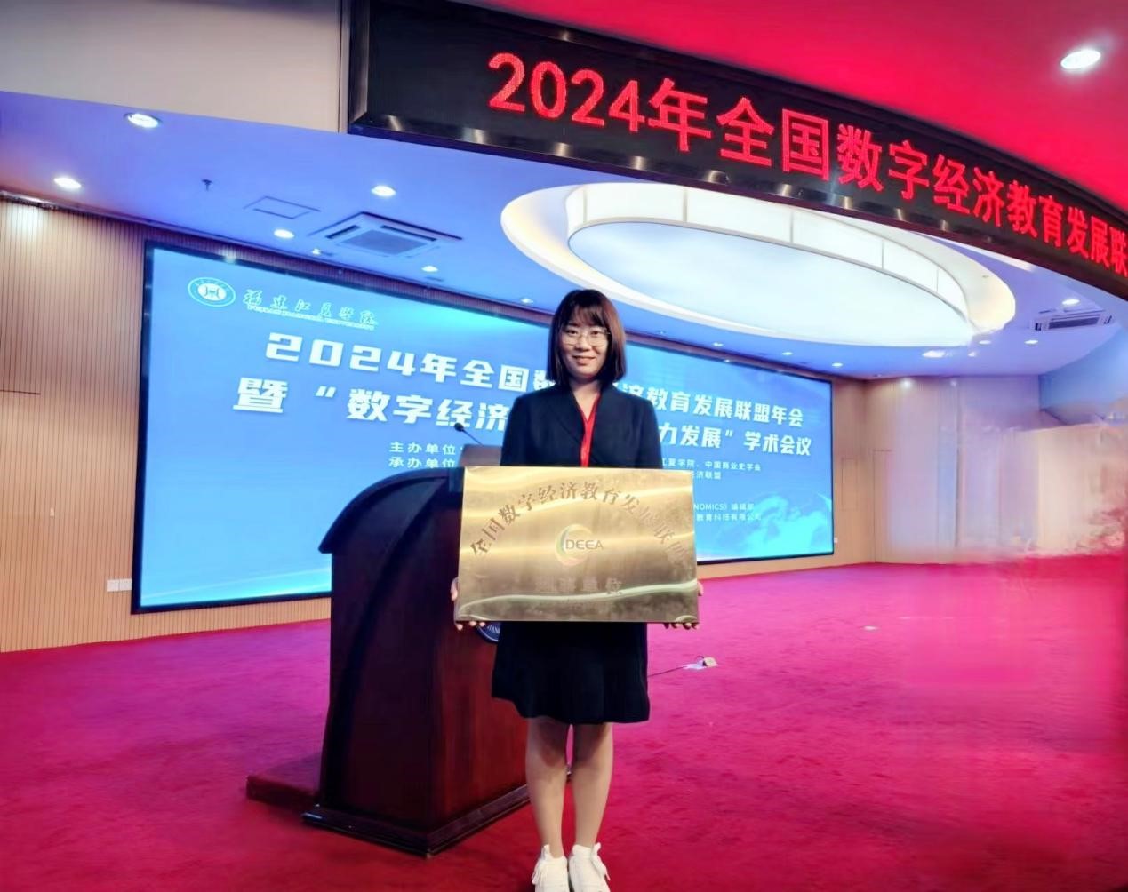 在年会开幕式上,弓媛媛代表学院参加全国数字经济教育发展联盟的授牌仪式,正式成为“全国数字经济教育发展联盟”理事单位。全国数字经济教育发展联盟是由中国人民大学、南京大学、中央财经大学等发起,汇聚了众多国内顶尖高校、科研机构及企业,旨在共同推进数字经济教育事业的创新和发展。此次获授牌成为全国数字经济教育发展联盟理事单位,标志着国产成人精品数字经济学科建设和人才培养获得了国内数字经济教育界的认可,也是对学校数字经济专业建设与发展的鼓励和支持。