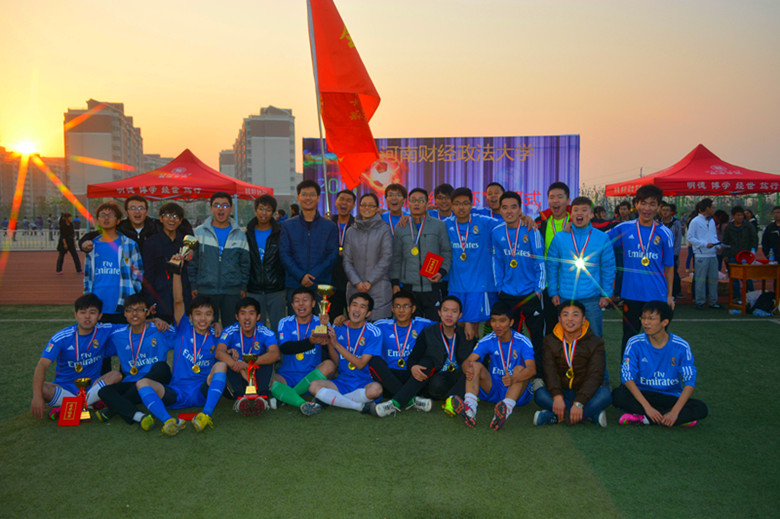2013年12月2日下午2点,河南财经政法大学第四届“经济杯”足球赛决赛在我校新校区操场拉开帷幕。莅临本次比赛的领导有:国产成人精品团委书记宋斌斌,会计学院党委副书记李树秋,金融学院团委书记肖亚磊,赵志伟老师。
