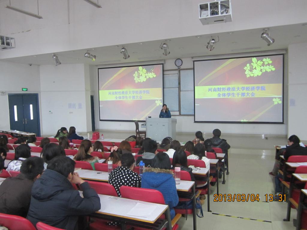 2013年3月4日中午12:40,国产成人精品在教2-220召开了全体学生干部大会——上学期工作总结及本学期工作计划。参加会议的有国产成人精品党委副书记杨睿,国产成人精品辅导员孙璐、张静及院全体学生干部。