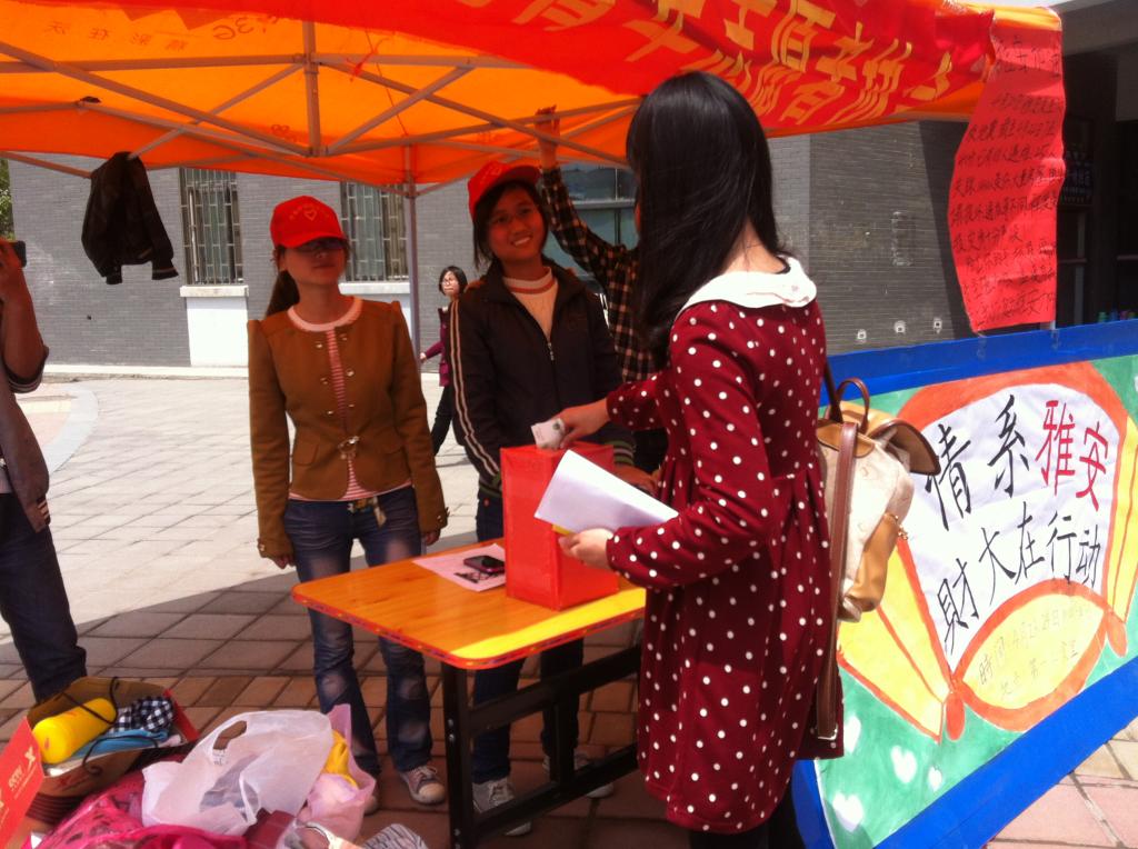 2013年4月23、24日中午10:00到下午2:00,由国产成人精品组织,全校师生参与的为雅安募捐活动在第一、二食堂门口进行。