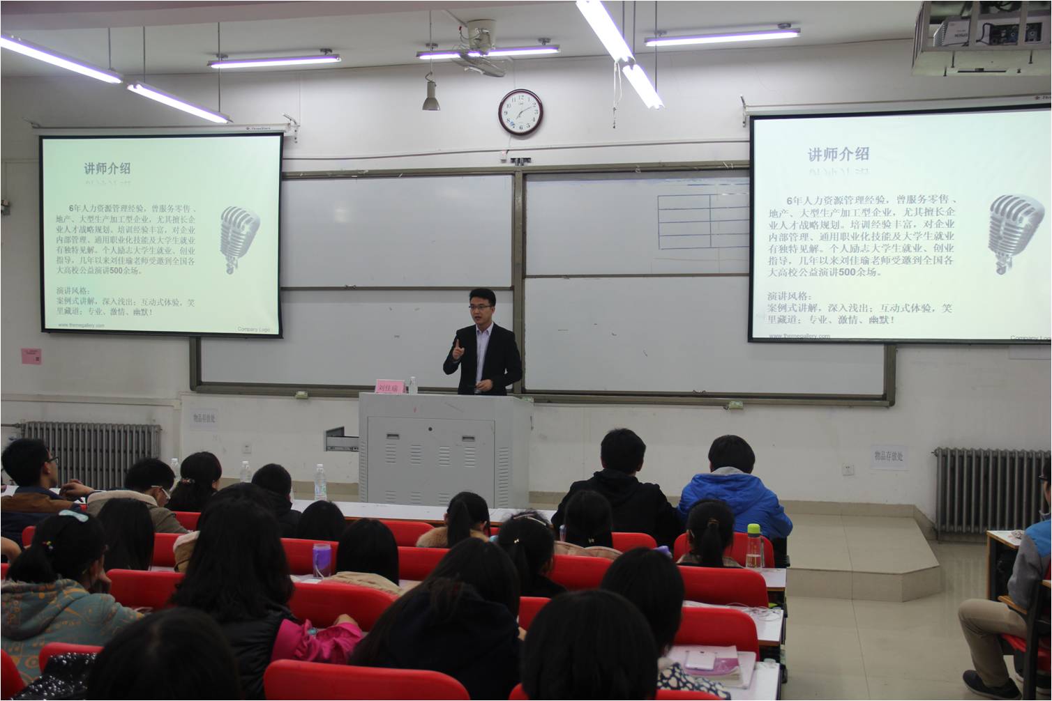 刘佳瑜老师拥有6年的人力资源管理经验,在各所高校巡回演讲500多次,有丰富的人生心得。演讲开始,刘老师用热情幽默的语言很快引起了学生们的兴趣。演讲过程中,刘老师深入浅出,笑里藏道,为同学们带来了一场视听盛宴。同学们在此过程中积极配合,与刘老师进行互动,现场氛围激情热烈,同学们获益匪浅。