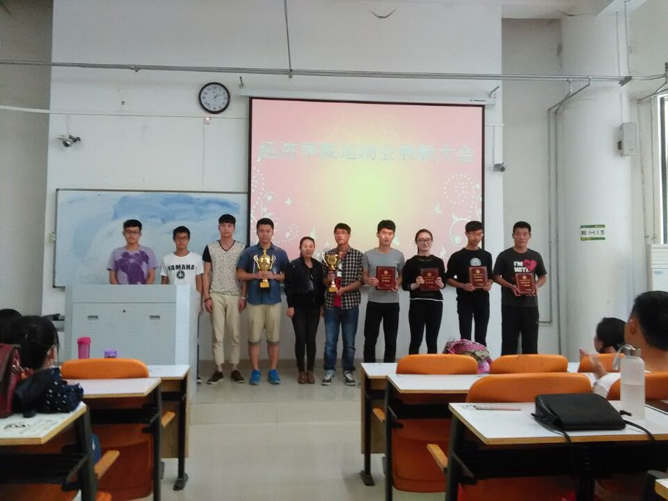 大会伊始,宋老师宣读在2015年运动会中获奖人员名单,对大家取得的优异成绩表示祝贺。接下来由运动员代表们发言,他们对此次运动会发表了自己的感想,并对当中的不足进行了反思,并指出了个人的努力和团队的力量以及组织人员和教练们的无私付出,希望在以后的比赛中再接再厉。从运动员慷慨激昂的演说中他们看到了他们的勇气和信心。最后,由杨书记做总结讲话,杨老师首先肯定了我们所取得的成绩,对运动员的坚持精神提出表扬,同时她教导我们要弘扬这种体育精神,把它传承下去。最后送我们九个字“爱自己,爱运动,爱经济”来鼓励我们。