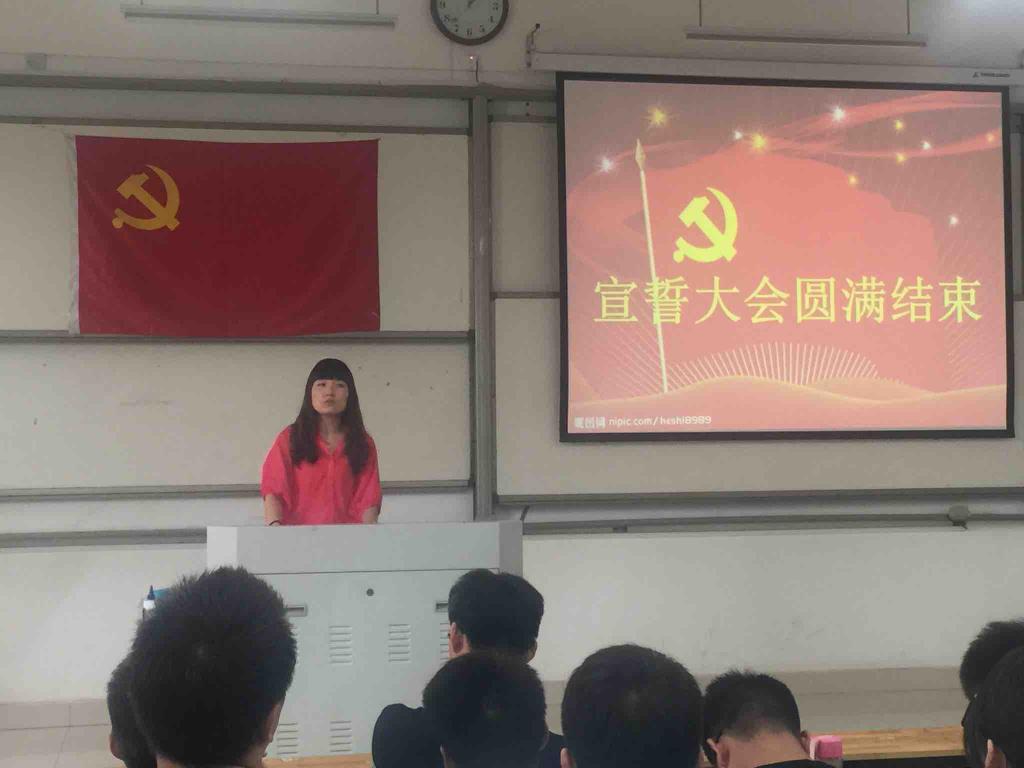鲜红的党旗,醒目的主题横幅渲染出仪式的庄重气氛,在雄壮的《义勇军进行曲》进行完毕后,宋斌斌老师宣读了新党员名单,宣誓仪式正式开始。此次宣誓由孙璐老师领誓,现场顿时响起了阵阵激昂的宣誓声。每个同学都用发自内心的声音抒发对党忠诚的决心。之后由新党员张蒙蒙同学做学生代表发言。她的演讲词道出了所有预备党员和正式党员的心声,她表达了自己要恪守在党旗下的诺言,更加严格要求自己,时刻保持党的先进性和先锋模范作用。接下来由院党委书记孙向东老师做总结讲话,他首先对活动的进行做了高度评价同时也对新党员们提出要求,教导他们要以认真的态度对待党,以坚定的信念捍卫党,以良好的作风塑造党。会议在再次奏完国歌后宣告结束。