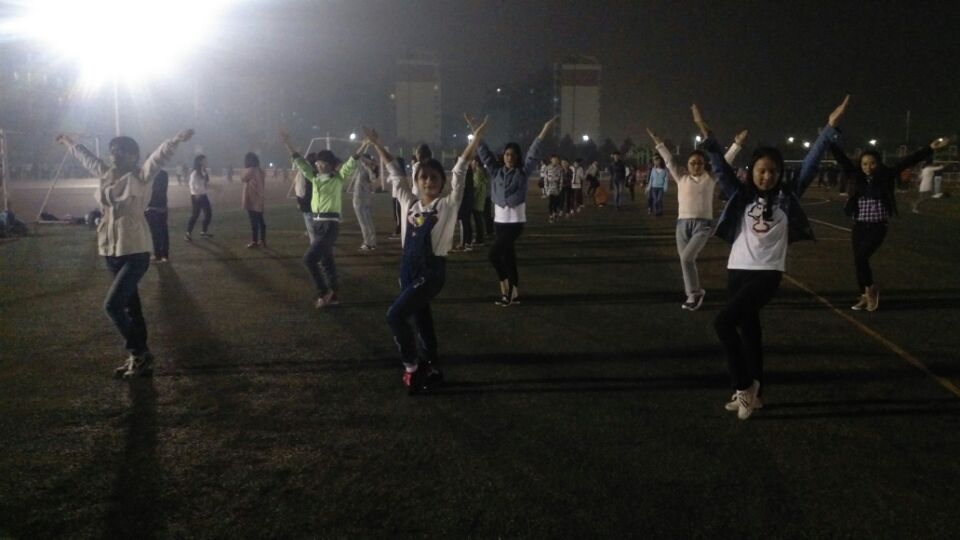 晚间的财大西操场,是一个展现自我特色的舞台。青春飞扬的姑娘用身形的滑动和舞步的跳跃,跟着节奏跳起啦啦操。看,她们脸上洋溢着笑容,动作整齐有力,用身姿诠释着青春的奔放,用热情编织青春的浪漫。跆拳道训练处,一个瘦小的女孩正举着比她还要重10斤的哑铃。她眉毛紧锁半抿着嘴唇,汗水一滴滴的从脸上划过。“快蹲慢起,坚持下来!”身边的队友都紧握双拳为她打气,其他队员也不甘示弱投入到紧张的基本功训练中。“加油,加油……”从远处传来一阵欢呼声,接力棒训练处于白热化阶段。50米加速跑、100米快跑让人应接不暇、昔日的女神立马变成女汉子,男同胞们也一个个拼尽全力奔跑着,传递手中的接力棒。他们闪电般从你身旁经过,只留下一阵风,传达了他们内心的狂热。