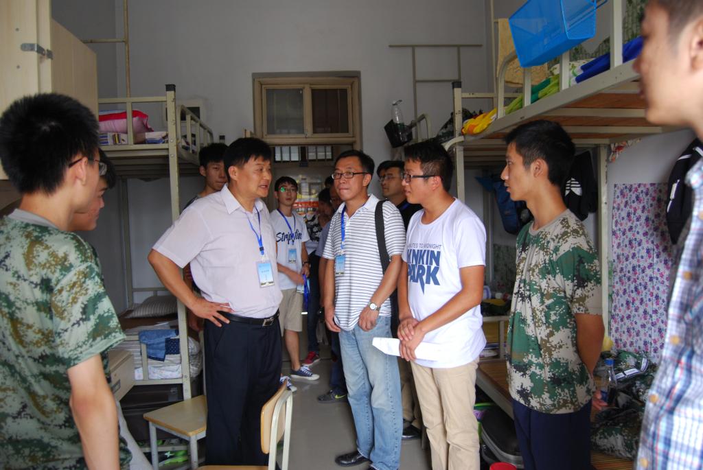 中午12点半,学院领导老师走进新生宿舍看望同学们。领导老师亲切问候同学们,询问同学们是否适应大学生活,外省同学是否适应食堂饭菜等,同时对同学们进行了必要的安全教育,涉及水电、财产、人身安全等各个方面。孙书记还鼓励同学们努力军训,发扬我院不怕苦,不怕累,力拼第一,为院争光的拼搏精神,增强了新生军训的决心与信心。