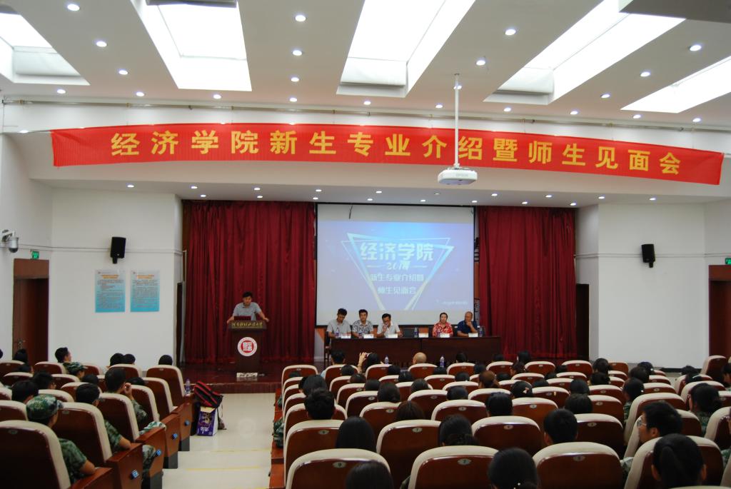 大会伊始,党委书记孙向东致欢迎辞,孙向东对2016级新生的到来表示欢迎,并寄语新生,在四年的学习及未来成长道路上既要脚踏实地,又要仰望星空,成为不负社会和时代期望的优秀经济人。随后,刘方副院长从学院基本情况、师资情况、专业情况、培养方案、课程设置等发面向新生作了详细介绍,鼓励同学们积极培育专业兴趣,成为“厚基础、宽口径”的综合型应用人才。最后,院长朱红恒致辞,他从大学与高中的区别、大学该如何度过角度,向新生提出要求和希望,鼓励新生尽快转换角色、明确目标,提升自身,成为合格人才。新生专业介绍暨师生见面会在热烈的掌声中圆满结束。