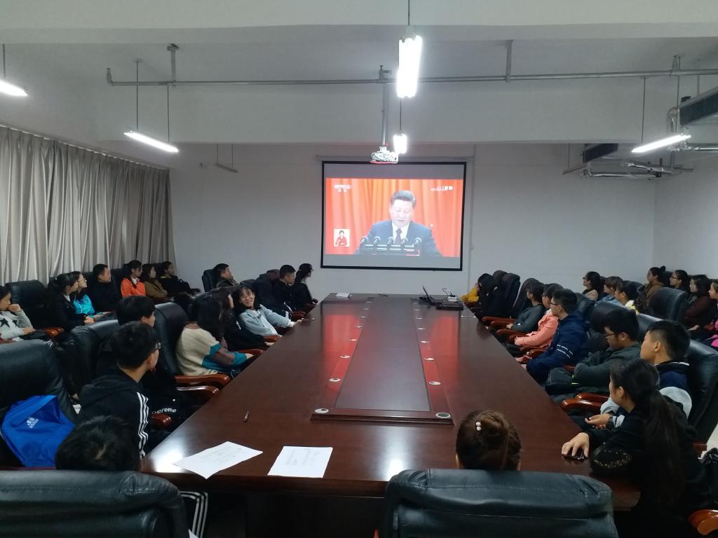 学院积极响应学校号召,老师带领青年学生前往第一教学楼219报告厅,与各学院师生共同观看开幕式直播。此外,学院在教学科研楼604会议室组织青年学生干部观看开幕式直播,观看过程中,在座学生聚精会神,仔细聆听报告内容,且开展专题讨论,分组交流心得,撰写学习体会。学院各团支部还以宿舍为单位,积极组织学生观看开幕式直播。
