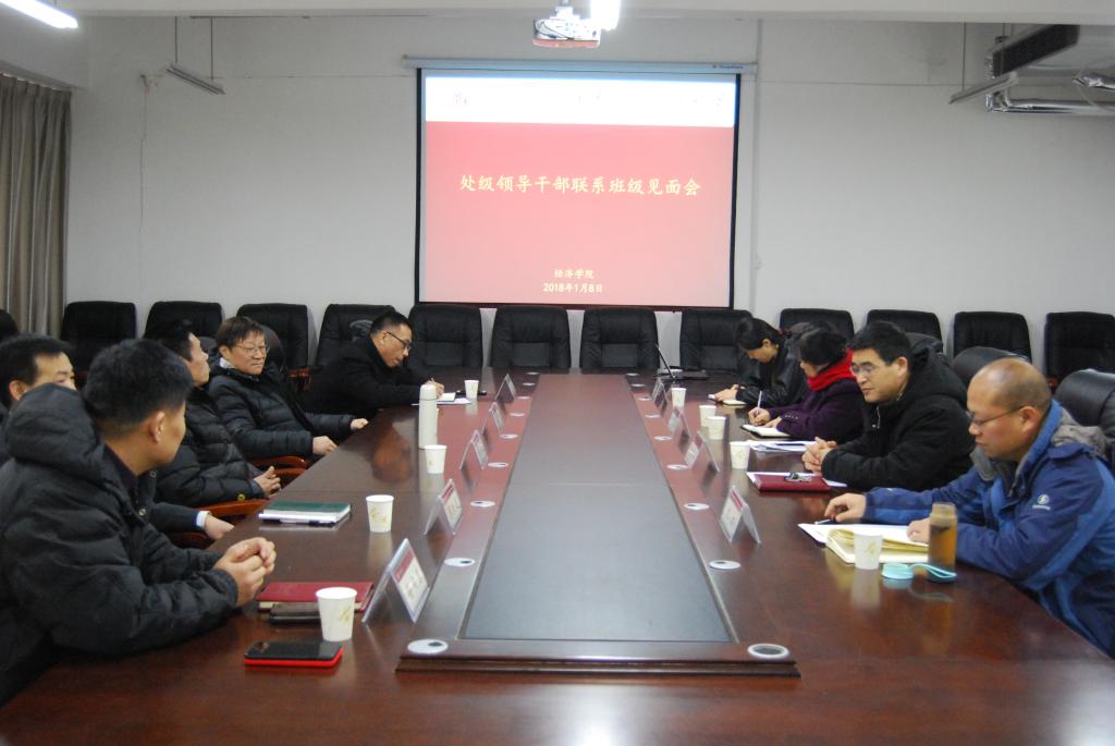1月8日上午9点,国产成人精品在郑东校区教学科研楼604会议室召开处级领导干部联系班级见面会。校招生办公室罗松远主任、现代教育技术中心书记程道普、主任郭清溥应邀莅临,国产成人精品党委书记孙向东、党委副书记刘昆峰等领导班子全体成员和主要学生干部参与此次见面会。