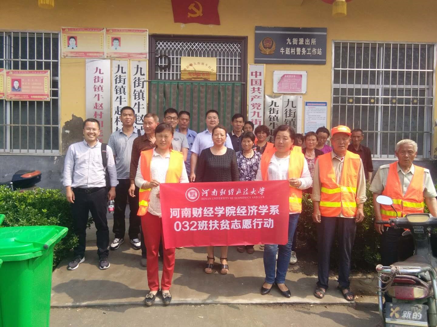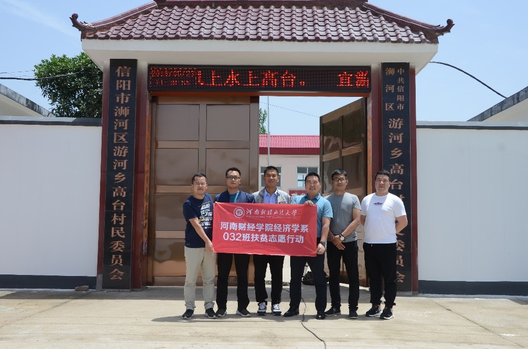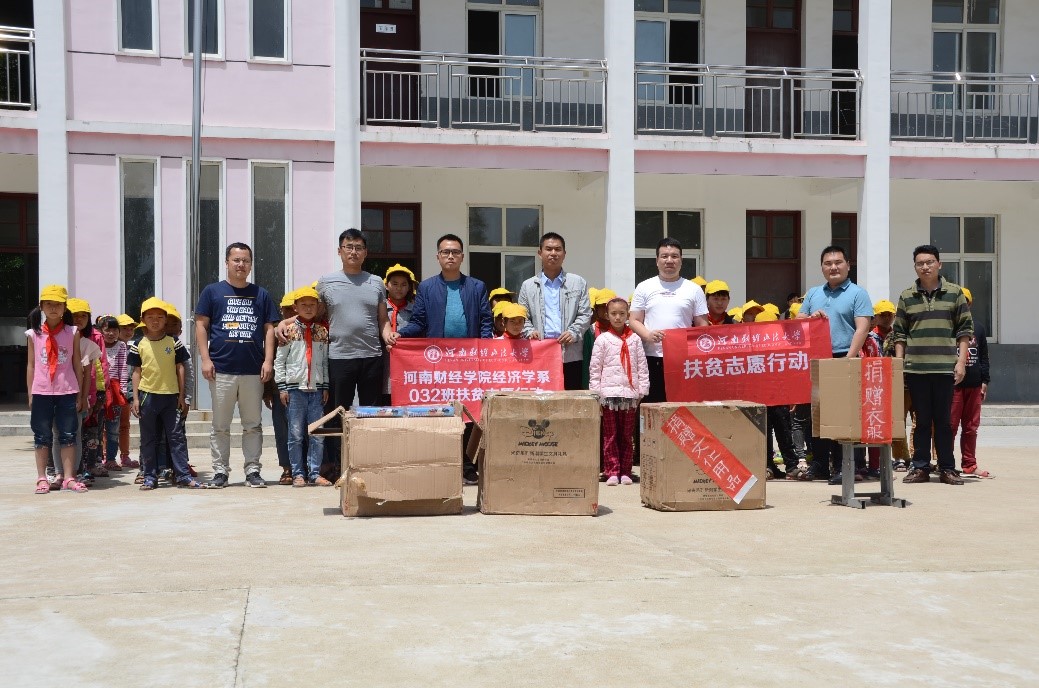 2018年5月16日、5月23日,原河南财经政法大学经济学系2003级2班毕业生代表赴漯河牛赵村、信阳高台村开展扶贫志愿活动。两村第一书记均为我校毕业生。此次活动由032班毕业生集体发起,旨在响应我省“决战脱贫攻坚、决胜全面建成小康社会”的号召,通过支教资金捐赠、公共基础设施物品捐赠、为产业扶贫献计献策等多种形式帮助当地扶贫事业的开展,以实际行动支持第一书记的工作。