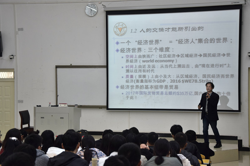 讲座上,赵伟首先对我校建校70周年表示诚挚的祝贺,随后进行了题为“贸易的逻辑,经济学视野看大势”的学术报告,从亚当.斯密的一个重要发现谈起,引入经济学视野,借以审视世界经济与中国经济,判断发展大局,落点是普通人的选择。