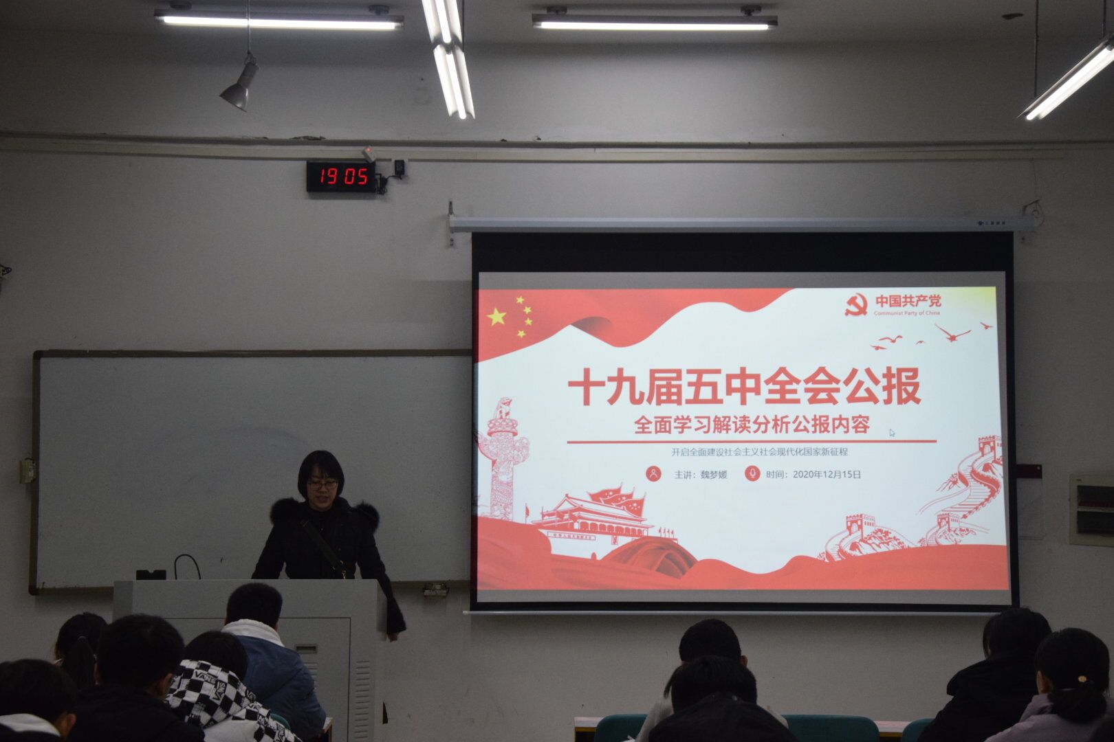 为进一步加强对青年学生骨干的思想政治教育,增进对十九届五中全会的理解,国产成人精品于2020年12月15日在教一103成功举办青马工程培训第二期。国产成人精品19、20级学生干部参与此次培训,此次活动由团委书记魏梦媛担任主讲人。