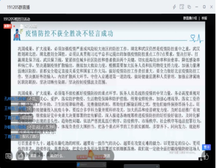此次活动的线上讨论发言取得了极好的效果,支部每个团员都表现得积极认真,积极参于线上讨论,对于团支书活动的安排表现得十分配合,在学习了解的和疫情目前的发展态势的时候大家非常认真,整体氛围十分严肃认真。
