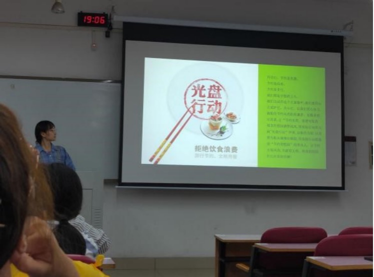 181201团支部,191203团支部,191206团支部通过PPT展示相关的理论,带领同学们认真学习贯彻习近平总书记对制止餐饮浪费行为的重要指示精神,深刻认识制止餐饮浪费行为的重大意义,增强粮食安全危机意识,强化勤俭节约行动自觉,筑牢浪费可耻、节约为荣的思想防线。181204团支部由团支书组织大家围坐一起,优秀团员肖云帆同学向大家讲解了光盘行动的历史来源。181205团支部,181206团支部为了使同学们更好地了解本次活动与主题,首先放映了有关习近平总书记关于“坚决制止餐饮浪费行为,切实培养节约习惯”的重要指示和有关铺张浪费的视频,体会到粮食的来之不易。