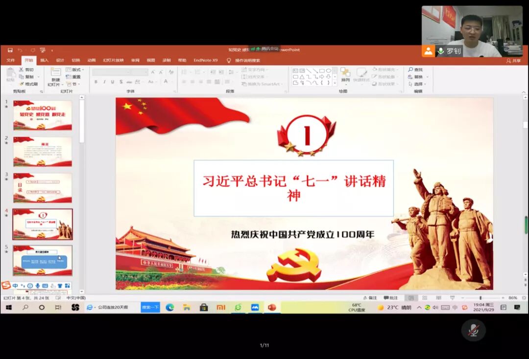 同时,辅导员罗钊为我院学生召开了线上学习“七一”重要讲话精神主题会议,并对党史学习教育内容进行了讲述。首先,辅导员罗钊分别从习近平同志“七一”重要讲话、“学党史,时刻不忘感党恩”两部分为学生进行讲述。会议中,辅导员罗钊赞扬了在百年里,中国共产党不怕牺牲、英勇斗争的奉献精神;回溯了在百年中,共产党在斗争中不断壮大、不断发展的艰辛历程。辅导员罗钊也提醒身为学生的我们,一定要端正自身态度、担负起时代使命,感恩党、跟党走。