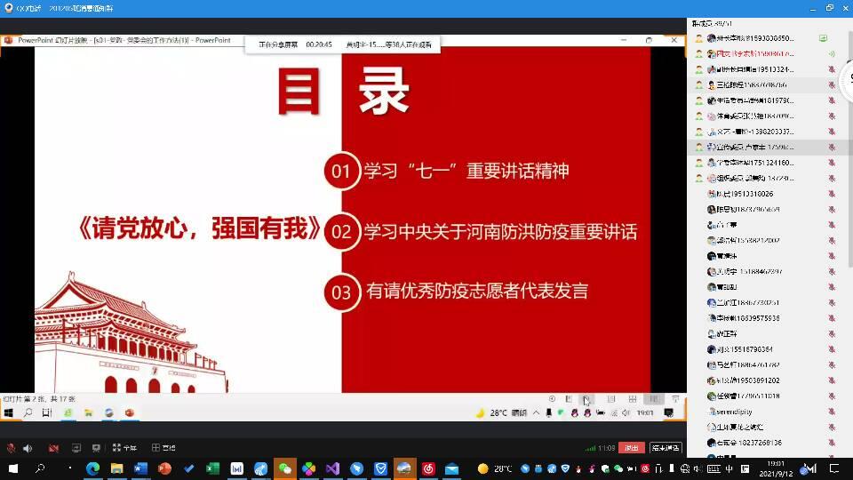 本次活动因疫情的防控尚未开学,采取了线上方式开展。本次活动在国庆之际,结合习近平同志发表的“七一”重要讲话深入开展了“请党放心,强国有我”的主题团日活动,共同学习了党的百年历程,重点关注了习近平新时代中国特色社会主义思想,在活动的最后共同来就党史的一些常识进行了回顾!