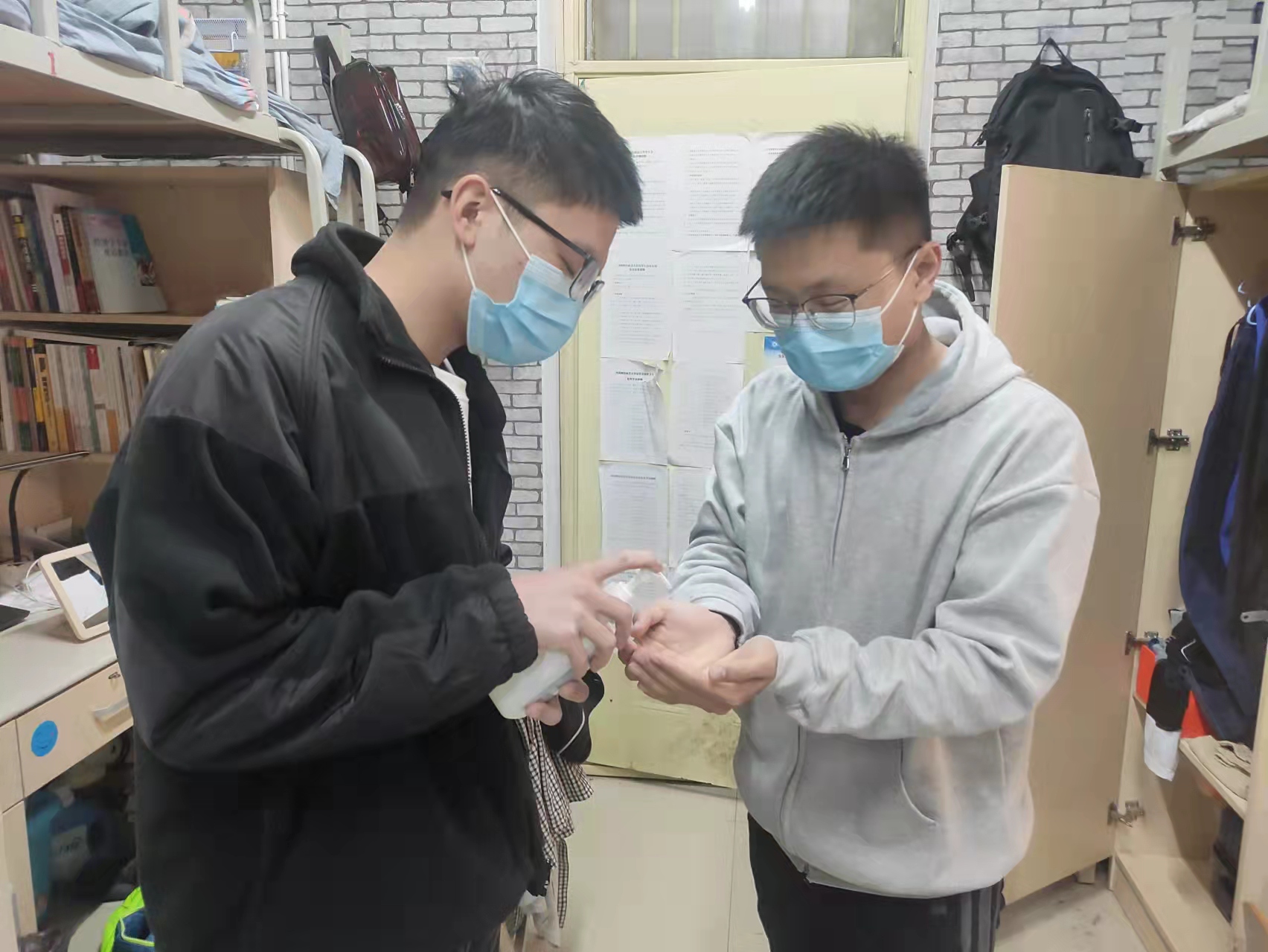 2021年11月7日,我院在静二414和静二415两个宿舍组织了疫情防控演练,本次演练一共有五个步骤。第一步:发现同学有发烧、咳嗽、乏力等疑似新冠肺炎症状。第一时间给患者戴上口罩等相应防护用品。第二步:立即向辅导员报告:今天晚上19:00有学生出现发烧、咳嗽、乏力等疑似新冠肺炎症状,目前该工作人员病情较重,发烧38.5度,已给患者戴上口罩等防护用品。第三步:学院实施“疫情应急处置预案”,落实必要防护措施,将患者转送至学校临时隔离点等待就医,由校医院将其送往相关医院发热门诊就诊。询问其外出、接触史,并上报学校。第四步:在病例诊疗的同时,对发热患者密切接触人员实行暂时隔离。辅导员负责通过电话、微信等方式,及时掌握就诊学生检查、治疗情况。第五步:学院疫情防控负责人尽快将该学生情况上报至学校。