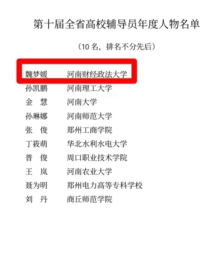 今日,中共河南省委教育工委、河南省教育厅组织开展了第十届全省高校辅导员年度人物评选活动。经学校推荐、材料评审、个人展示答辩、综合评议和结果公示等环节,我院团委书记、辅导员魏梦媛以总积分排名第一的成绩荣膺“第十届全省高校辅导员年度人物”称号。