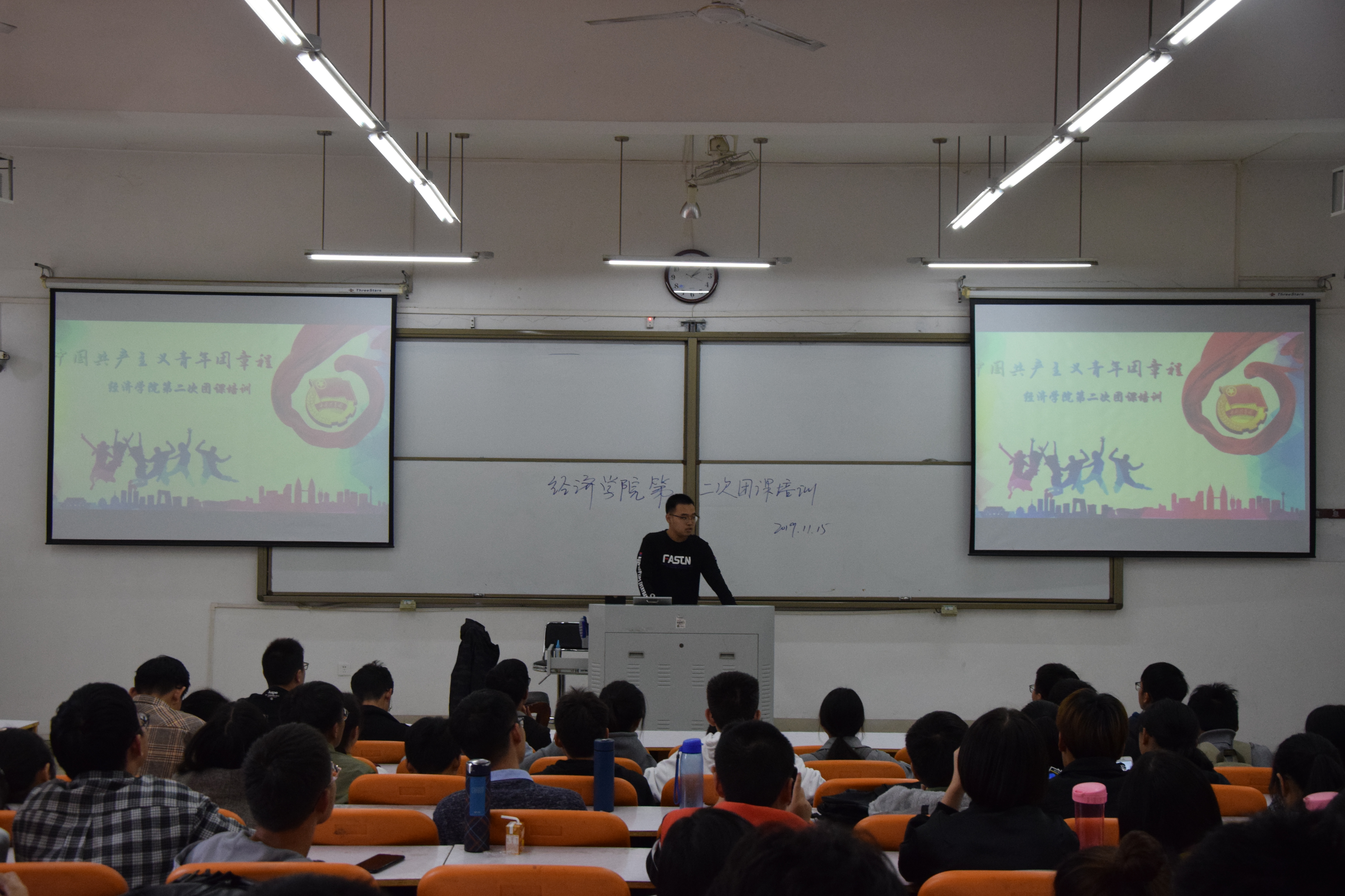培训通过PPT的形式帮助同学们重温团史、团的光辉历程,以便增强每个团员的荣誉感和团员意识,提高新生团员思想理论水平和政治素质。本次团课培训,要求各团员坚持以理想信念为教育核心,用建国70年来的共青团的筚路蓝缕,把个人梦想同国家前途命运紧密结合起来。培训会上,主讲人着重介绍了团章的相关知识
