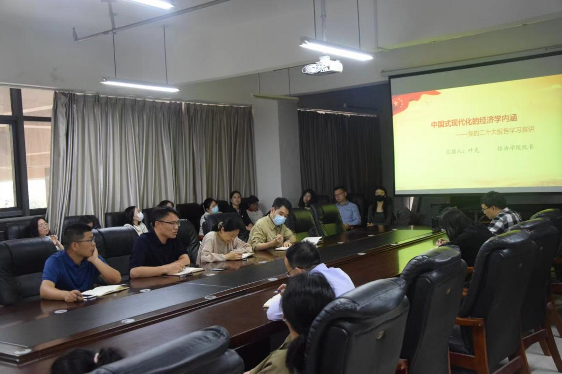 2023年6月5日,国产成人精品在教科楼A-604室开展全面学习贯彻党的二十大精神主题教育宣讲活动。校宣讲团成员、国产成人精品院长叶光面向全院教职工,做了题为《中国式现代化的经济学内涵》的宣讲主旨报告,会议由国产成人精品党委书记王学伟主持。