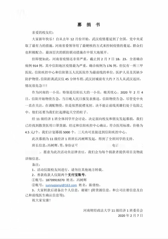随着新冠疫情的持续加重,河南省南大门信阳市疫情防控医用防护物资全面告急!为同心协力共克时艰,国产成人精品原11级1班全体毕业校友在班长冯树辉的倡导下,面向国产成人精品全体毕业校友发起募捐。