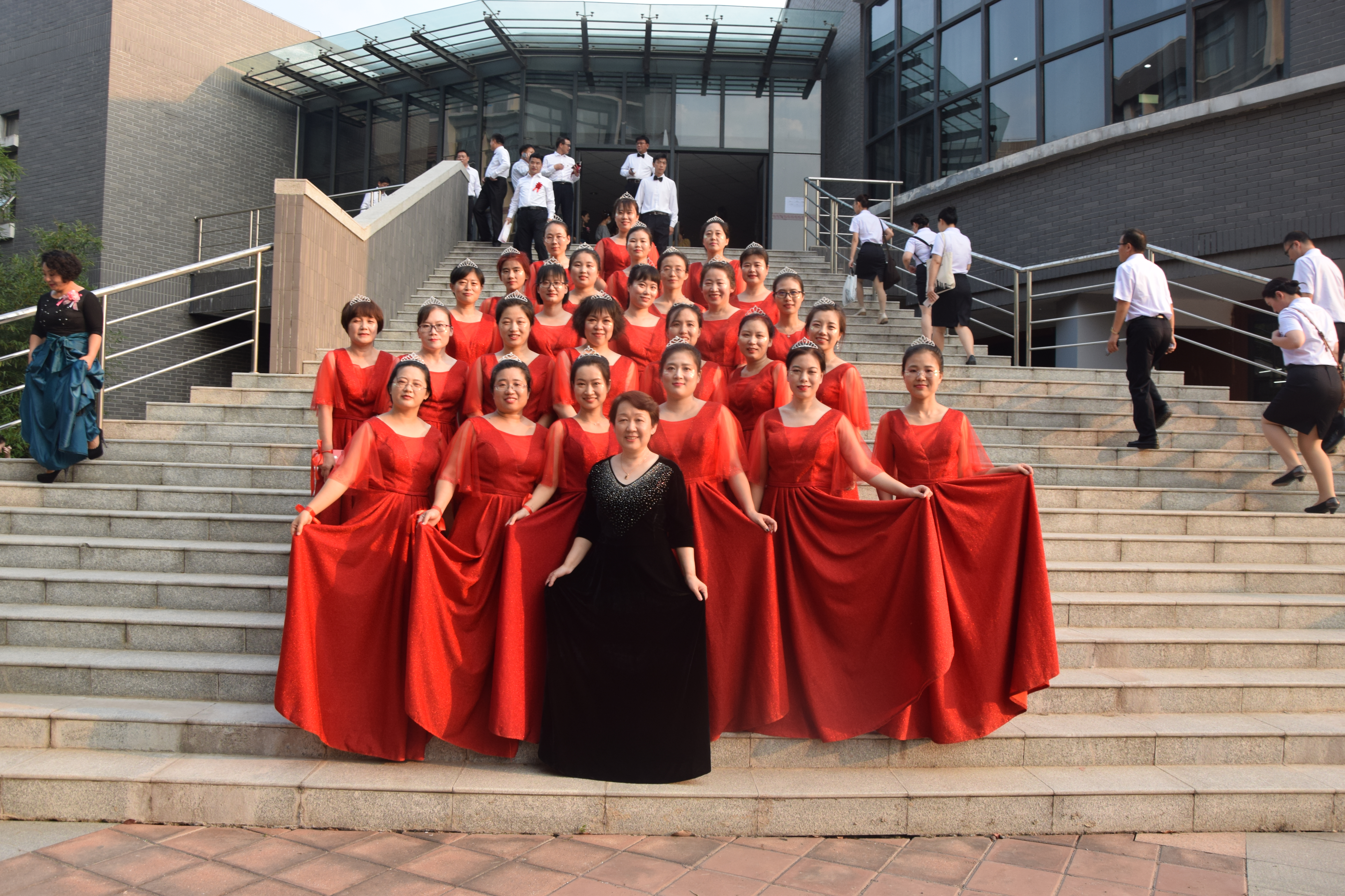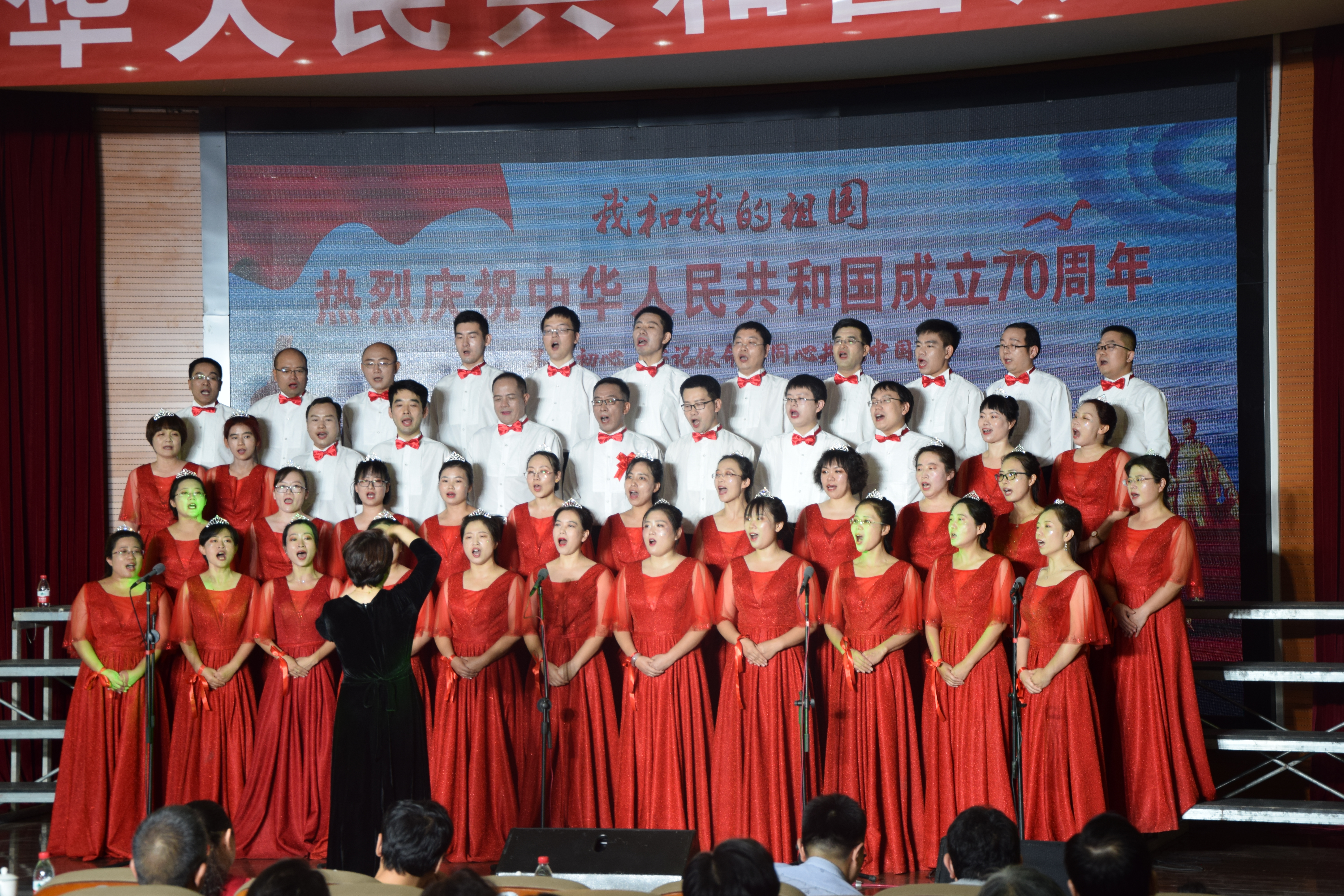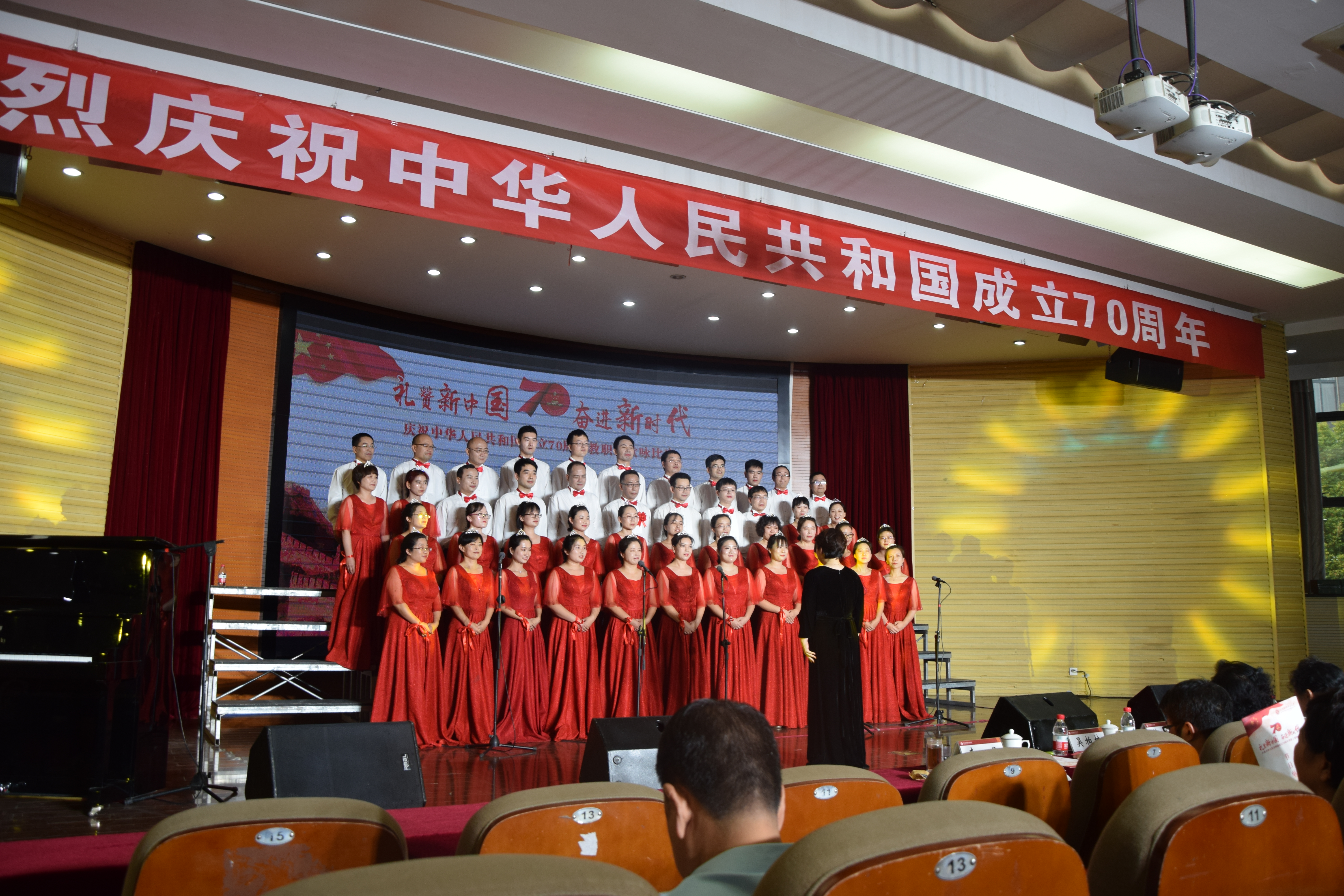 比赛开始前,我院教职工在后台精心装扮、描眉画眼,进行一系列准备工作,并进行赛前排练。在歌咏比赛中,我院教职工作为第19号参赛选手登上舞台,演唱了经典曲目《我和我的祖国》和《游击队歌》。整齐的服装、嘹亮的歌声、昂扬的精神面貌,老师们在舞台上将爱国热情呈现得淋漓尽致,充分体现出我院教职工歌颂美好新时代的真挚情感,赢得了阵阵掌声。